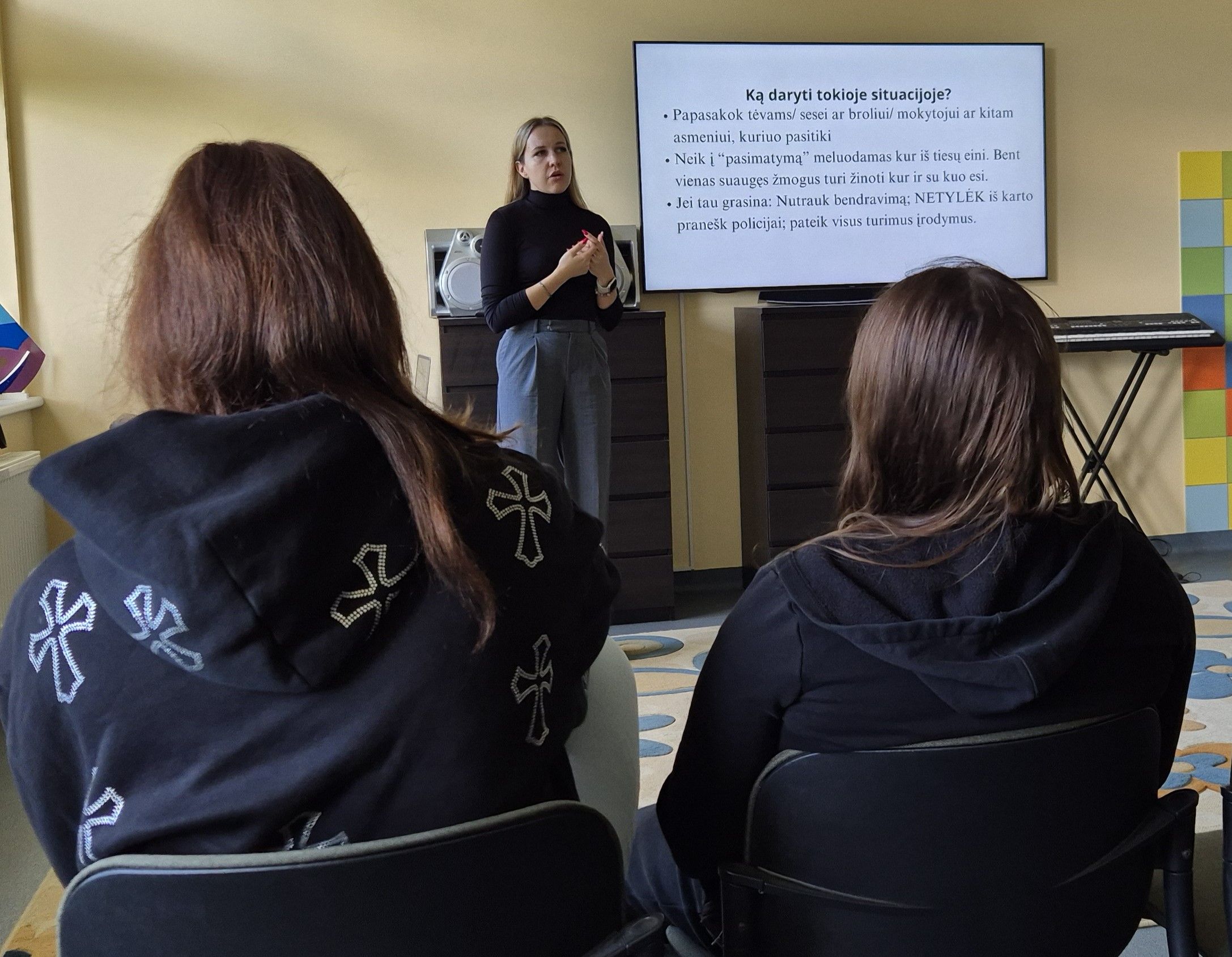 Rugsėjo 27 d. Kunionių skyriuje lankėsi Dingusių žmonių šeimų paramos centro atstovės Arūnė Bernatonytė ir Ugnė Janevičiūtė. Prekyba žmonėmis – tai neteisėta veika, šiurkščiai pažeidžianti prigimtines žmogaus teises. Ugdytinės sužinojo, kokios yra prekybos žmonėmis formos, kaip atpažinti blogus kėslus turinčius asmenis ir kaip pasielgti tokioje situacijoje. Po teorinės ir vaizdinės medžiagos vyko protmūšis. Susitikimo pabaigoje lektorės atsakė į ugdytinių klausimus ir apdovanojo mergaites saldžiais prizais.
